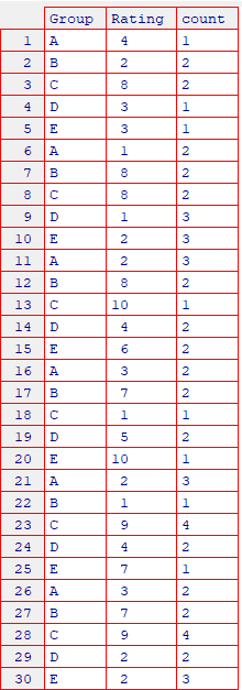 Group Rating 1 A 4 2 B 2 3 C 8 4 D 3 5 E 3 6 A 1 7 B 8 8 C 8 9 D 1 10 E 2 11 A 2 12 B 8 13 C 10 14 D 4 15 E 6 16 A 3 17 B 7 18 C 1 19 D 5 20 E 10