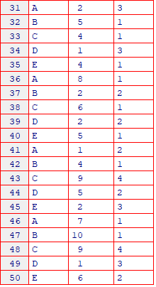 Group Rating 31 A 2 32 B 5 33 C 4 34 D 1 35 E 4 36 A 8 37 B 2 38 C 6 39 D 2 40 E 5 41 A 1 42 B 4 43 C 9 44 D 5 45 E 2 46 A 7 47 B 10 48 C 9 49 D 1 50 E 6