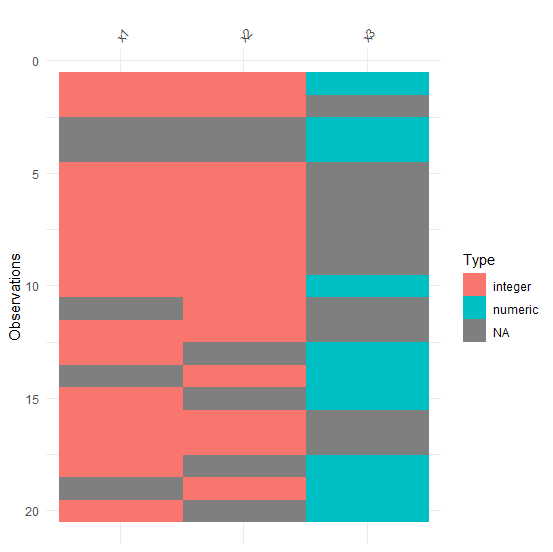 如果一個 DataFrame 包含缺失值,那麼在基礎 R 中視覺化它並不容易,但我們可以為此目的使用 visdat 包。visdat 包的 vis_dat 函式有助於視覺化任何 DataFrame,即使它包含缺失值。例如,如果一個 DataFrame df 包含缺失值,則可以將其視覺化為 vis_dat(df)。