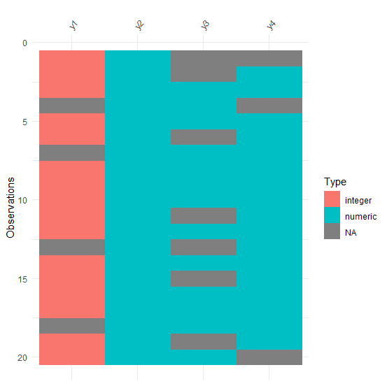 > y1<-sample(c(NA,rpois(5,2)),20,replace=TRUE) > y2<-rnorm(20) > y3<-sample(c(NA,rnorm(5,2,2.1)),20,replace=TRUE) > y4<-sample(c(NA,runif(5,2,3)),20,replace=TRUE) > df2<-data.frame(y1,y2,y3,y4) > df2