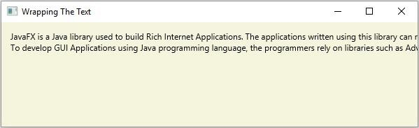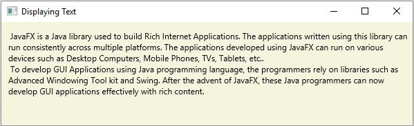 在JavaFX中,文字節點由Javafx.scene.text.Text類表示。要在JavaFx視窗中插入/顯示文字,您需要: