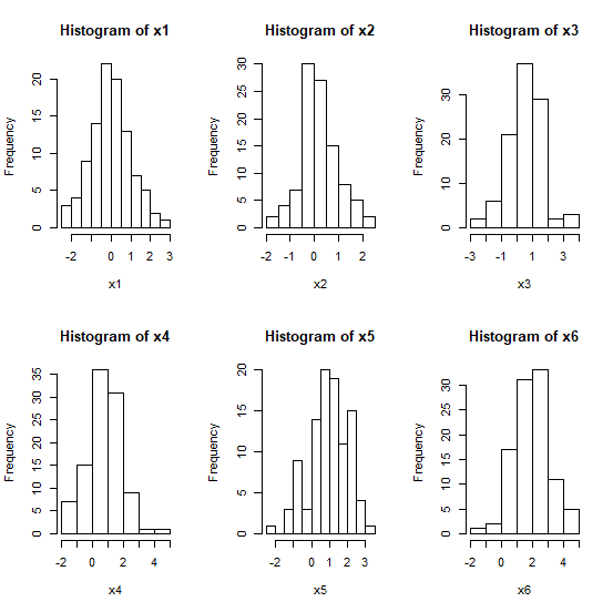 set.seed(100) x1<-rnorm(100) x2<-rnorm(100,0.2) x3<-rnorm(100,0.5) x4<-rnorm(100,0.8) x5<-rnorm(100,1.1) x6<-rnorm(100,1.8) par(mfrow=c(2,3)) hist(x1) hist(x2) hist(x3) hist(x4) hist(x5) hist(x6)