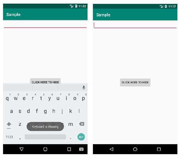 Toast.makeText(MainActivity.this,"Keyboard is showing",Toast.LENGTH_LONG).show();