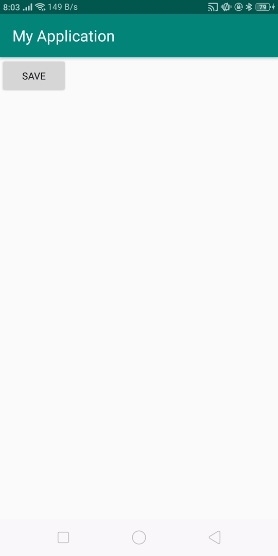 <?xml version = "1.0" encoding = "utf-8"?> <LinearLayout xmlns:android = "http://schemas.android.com/apk/res/android" xmlns:tools = "http://schemas.android.com/tools" android:layout_width = "match_parent" android:layout_height = "match_parent" tools:context = ".MainActivity" android:orientation = "vertical"> <Button android:id = "@+id/save" android:text = "save" android:layout_width = "wrap_content" android:layout_height = "wrap_content" /> </LinearLayout>