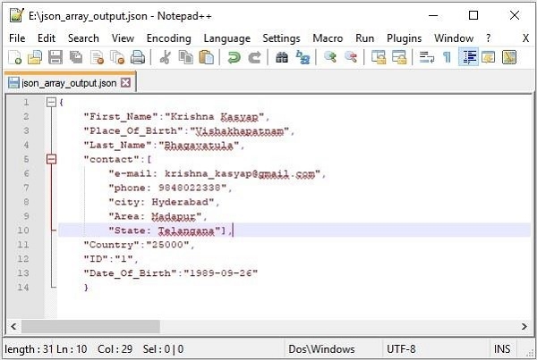 "Date_Of_Birth":"1989-09-26"}如果您檢視JSON檔案的內容,您可以看到建立的資料如下: