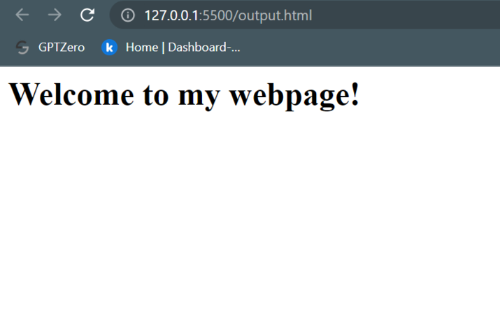 file.write("<html>") file.write("<head>") file.write("<title>My Webpage</title>") file.write("</head>") file.write("<body>") file.write("<h1>Welcome to my webpage!</h1>") file.write("</body>") file.write("</html>")