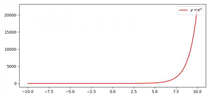 import numpy as np from matplotlib import pyplot as plt plt.rcParams["figure.figsize"] = [7.50, 3.50] plt.rcParams["figure.autolayout"] = True x = np.linspace(-10, 10, 100) y = np.exp(x) plt.plot(x, y, color='red', label="$y=e^{x}$") plt.legend(loc='upper right') plt.show()