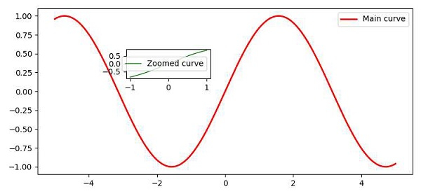 import numpy as np from matplotlib import pyplot as plt plt.rcParams["figure.figsize"] = [7.50, 3.50] plt.rcParams["figure.autolayout"] = True x = np.linspace(-5, 5, 1000) y = np.sin(x) x_zoom = np.linspace(-1, 1, 50) y_zoom = np.sin(x_zoom) plt.plot(x, y, c='red', lw=2, label="Main curve") plt.legend() axes = plt.axes([.30, .6, .20, .15]) axes.plot(x_zoom, y_zoom, c='green', lw=1, label="Zoomed curve") axes.legend() plt.show()