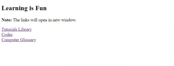 <!DOCTYPE html> <html> <body> <h2>Learning is Fun</h2> <p><strong>Note −</strong> The links will open in new window.</p> <p><a href="https −//tutorialspoint.tw/tutorialslibrary.htm" target="_blank">Tutorials Library</a><br> <a href="https −//tutorialspoint.tw/programming_examples/" target="_blank">Codes</a><br> <a href="https −//tutorialspoint.tw/computer_glossary.htm" target="_blank">Computer Glossary</a> <br> </body> </html>