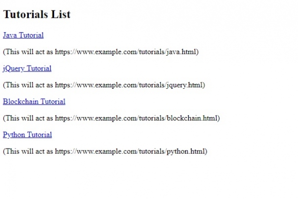 <!DOCTYPE html> <html> <head> <base href="https://www.example.com/tutorials/"> </head> <body> <h2>Tutorials List</h2> <p><a href="java.html">Java Tutorial</a></p><p>(This will act as https://www.example.com/tutorials/java.html)</p> <p><a href="jquery.html">jQuery Tutorial</a></p><p>(This will act as https://www.example.com/tutorials/jquery.html)</p> <p><a href="blockchain.html">Blockchain Tutorial</a></p><p>(This will act as https://www.example.com/tutorials/blockchain.html)</p> <p><a href="python.html">Python Tutorial</a></p><p>(This will act as https://www.example.com/tutorials/python.html)</p> </body> </html>