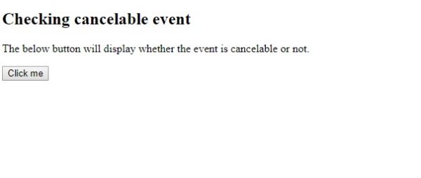 <!DOCTYPE html> <html> <body> <h2>Checking cancelable event</h2> <p>The below button will display whether the event is cancelable or not.</p> <button onclick="myFunction(event)">Click me</button> <p id="myid"></p> <script> function myFunction(event) { var val = event.cancelable; document.getElementById("myid").innerHTML = val; } </script> </body> </html>