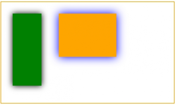 <!DOCTYPE html> <html> <body> <canvas id="newCanvas" width="600" height="350" style="border:2px solid orange;"> </canvas> <script> var c = document.getElementById("newCanvas"); var ctx = c.getContext("2d"); ctx.shadowBlur = 20; ctx.shadowColor = "black"; ctx.fillStyle = "green"; ctx.fillRect(40, 40, 100, 250); ctx.shadowBlur = 30; ctx.shadowColor = "blue"; ctx.fillStyle = "orange"; ctx.fillRect(200, 40, 200, 150); </script> </body> </html>