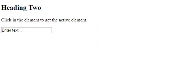 <!DOCTYPE html> <html> <body onclick="display()"> <h2>Heading Two</h2> <p>Click in the element to get the active element.</p> <input type="text" value="Enter text..."> <p id="myid"></p> <script> function display() { var a = document.activeElement.tagName; document.getElementById("myid").innerHTML = a; } </script> </body> </html>