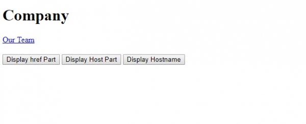 <!DOCTYPE html> <html> <body> <h1>Company</h1> <p><a id="mylink" href="http://www.abc.com:6064/abc/def.html#myteam">Our Team</a></p> <h2 id="myid"></h2> <button onclick="display()">Display href Part</button> <button onclick="display2()">Display Host Part</button> <button onclick="display3()">Display Hostname</button> <script> function display() { var a = document.getElementById("mylink").href; document.getElementById("myid").innerHTML = a; } function display2() { var a = document.getElementById("mylink").host; document.getElementById("myid").innerHTML = a; } function display3() { var a = document.getElementById("mylink").hostname; document.getElementById("myid").innerHTML = a; } </script> </body> </html>