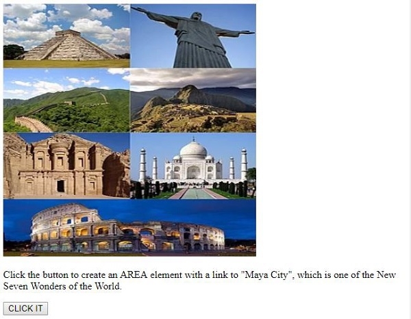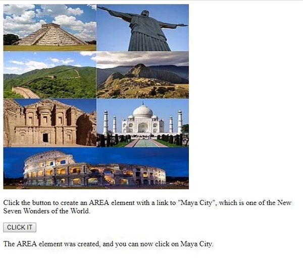 <p>Click the button to create an AREA element with a link to "Maya City", which is one of the New Seven Wonders of the World.</p>