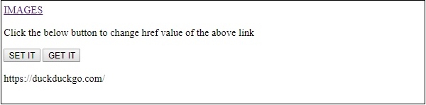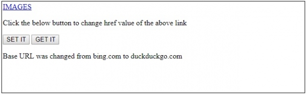 SetHref() 函式使用“myBase” ID 獲取 <base> 元素。然後,它使用 href 屬性將其 URL 設定為 https://www.duckduckgo.com。更改成功訊息顯示在 ID 為“Sample”的段落中。
