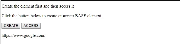 CreateBase() 函式建立一個 base 元素並將其賦值給變數 x。然後使用 setAttribute() 方法設定其 id 和 href。新建立的 base 元素隨後使用 appendChild() 屬性附加到文件頭部。最後,base 建立訊息顯示在與其關聯的 id 為 SAMPLE 的段落中。