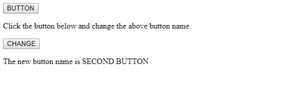 change() 函式獲取 id 為“button1”的按鈕元素,並將其 name 屬性值更改為“SECOND BUTTON”。然後將按鈕的 name 值賦給變數x,最後顯示在 id 為“Sample”的段落中。