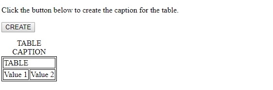 createCaption() 方法使用文件物件的 createElement() 方法建立了標題元素,並將其分配給變數 x。然後它建立了一個帶有“TABLE CAPTION”文字的文字節點。然後我們將該文字節點附加到該元素。