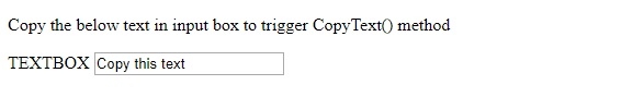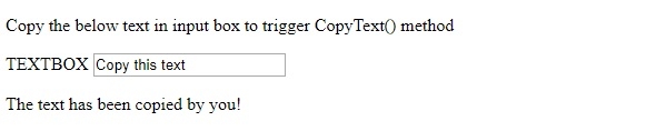 我們建立了一個 <input> 元素,型別為文字。它有一個名為 TEXTBOX 的標籤,並且已經包含一些文字供使用者選擇。當用戶複製文字時,將執行 CopyText() 方法。