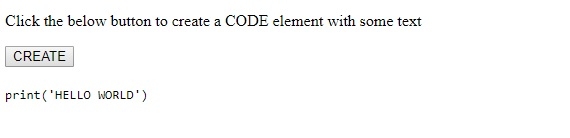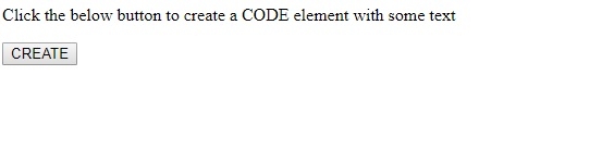 createCode() 方法使用文件物件的 createElement(“CODE”) 方法建立一個 <code> 元素。建立的元素分配給變數 x。然後在文件物件上使用 createTextNode() 方法建立一個帶有文字的文字節點。該文字節點使用變數 x 上的 appendChild() 方法追加到 <code> 元素的子元素中。