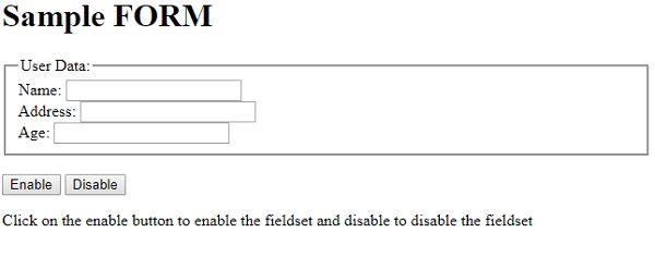 <p>Click on the enable button to enable the fieldset and disable to disable the fieldset</p>
