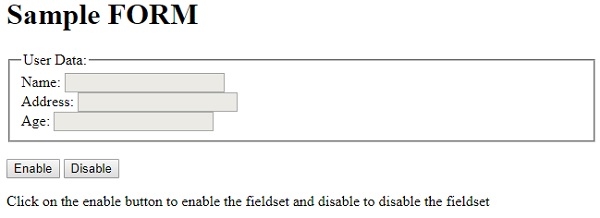 fieldEnable() 和 FieldDisable() 函式分別將 fieldset disabled 屬性設定為 true 和 false。這使我們能夠啟用或停用存在於指定 fieldset 內的那些元素 -