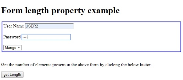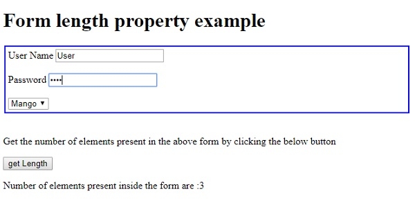 }getLength() 函式使用文件物件的 getElementById() 方法獲取 <form> 元素,並將它的 length 屬性值分配給變數 len。因為表單元素內共有 3 個元素,所以它返回 3。然後將這個值使用它的 innerHTML 屬性以及分配給它的文字顯示在 ID 為 “Sample” 的段落中。
