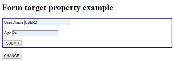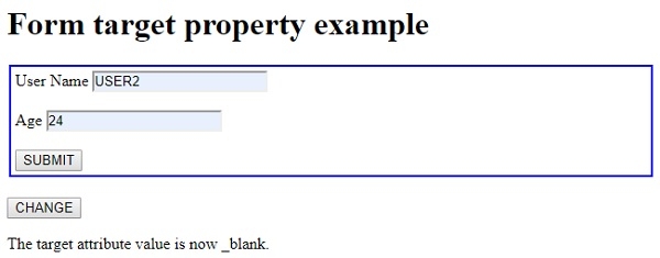 ChangeTarg() 方法將使用 document 物件的 getElementById() 方法獲取 <form> 元素,並將它的 target 屬性值更改為“_blank”。這允許表單資料提交後的響應在新標籤頁中顯示。此更改然後透過將文字分配給 id 為“Sample”的段落並使用其 innerHTML 屬性來顯示。