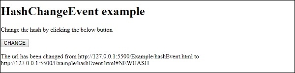 }一旦 hash 更改,與 body 標記關聯的 onhashchange 事件處理函式就會觸發,並將 haschange 事件作為物件傳遞給函式 showChange() −