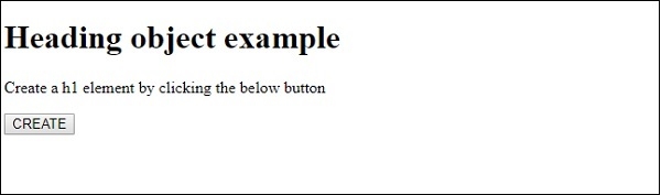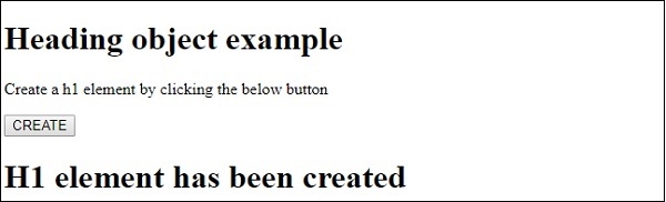 CreateH1() 方法使用檔案物件上的 createElement() 方法建立一個 <h1> 標題元素,並將其指定給變數 h。然後我們使用檔案物件的 createTextNode() 方法為它建立一個文位元組點。文位元組點使用 appendChild() 方法附加到 <h1> 元素。最後,<h1> 元素以及文位元組點一同使用 appendChild() 方法附加為檔案的本體的子節點 −