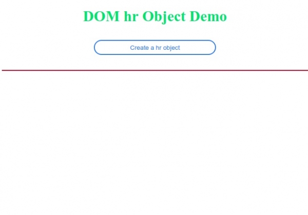 <!DOCTYPE html> <html> <style> body { text-align: center; background-color: #fff; color: #0197F6; } h1 { color: #23CE6B; } .btn { background-color: #fff; border: 2px solid #0197F6; height: 2rem; width: 40%; margin: 2rem auto; display: block; color: #0197F6; outline: none; cursor: pointer; border-radius: 20px; } hr { border-color: #db133a; } </style> <body> <h1>DOM hr Object Demo</h1> <button onclick="createHr()" class="btn">Create a hr object</button> <script> function createHr() { var insElement = document.createElement("HR"); document.body.appendChild(insElement); } </script> </body> </html>