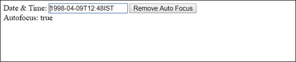 <!DOCTYPE html> <html> <head> <title>Input Datetime Autofocus</title> </head> <body> Date & Time: <input type="datetime" id="Datetime" value="1998-04-09T12:48IST" autofocus> <button onclick="removeAutoFocus()">Remove Auto Focus</button> <div id="divDisplay"></div> <script> var divDisplay = document.getElementById("divDisplay"); var inputDatetime = document.getElementById("Datetime"); divDisplay.textContent = 'Autofocus: '+inputDatetime.autofocus function removeAutoFocus() { if(inputDatetime.autofocus == true){ inputDatetime.autofocus = false; divDisplay.textContent = 'Autofocus: '+inputDatetime.autofocus } } </script> </body> </html>