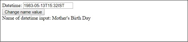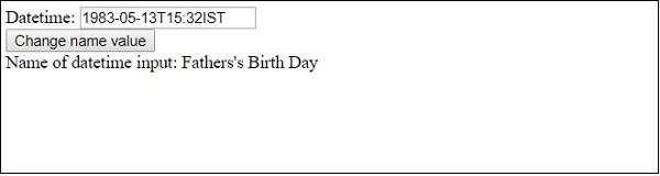 <!DOCTYPE html> <html> <head> <title>Input Datetime Name</title> </head> <body> <form> Datetime: <input type="datetime" id="datetime" name="Mother's Birth Day" value="1983-05-13T15:32IST"> </form> <button onclick="changeNameValue()">Change name value</button> <div id="divDisplay"></div> <script> var inputDatetime = document.getElementById("datetime"); var divDisplay = document.getElementById("divDisplay"); divDisplay.textContent = 'Name of datetime input: '+inputDatetime.name; function changeNameValue() { if(inputDatetime.name == "Mother's Birth Day"){ inputDatetime.name = "Fathers's Birth Day"; divDisplay.textContent = 'Name of datetime input: '+inputDatetime.name; } } </script> </body> </html>