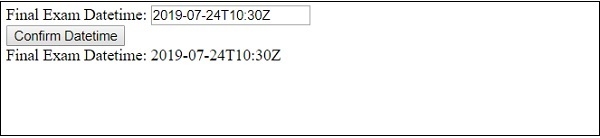 <!DOCTYPE html> <html> <head> <title>Input Datetime required</title> </head> <body> <form> Final Exam Datetime: <input type="datetime" id="datetimeSelect" value="" required> </form> <button onclick="finalizeDatetime()">Confirm Datetime</button> <div id="divDisplay"></div> <script> var divDisplay = document.getElementById("divDisplay"); var inputDatetime = document.getElementById("datetimeSelect"); divDisplay.textContent = 'Exam Datetime Required: '+inputDatetime.required; function finalizeDatetime() { if(inputDatetime.value === '') divDisplay.textContent += ', Give a valid Exam Datetime. '; else divDisplay.textContent = 'Final Exam Datetime: '+inputDatetime.value } </script> </body> </html>