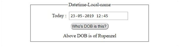 讓我們看一個 Input DatetimeLocal name 屬性的示例 −