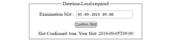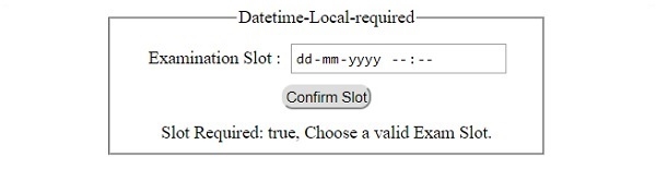 divDisplay.textContent = 'Slot Confirmed: '+inputDatetimeLocal.required+', Your Slot: '+inputDatetimeLocal.value;