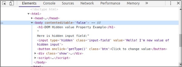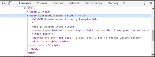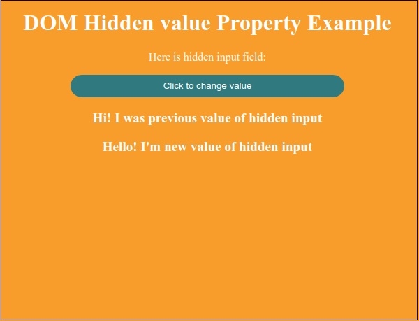 點選“點選更改值”按鈕更改隱藏輸入域的值。檢視控制檯截圖可輕鬆瞭解 −