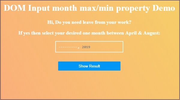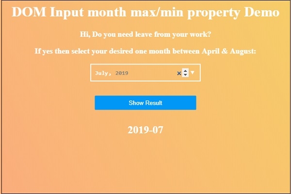 使用月份輸入欄位選擇任何月份(4 月至 8 月之間),然後點選“ 顯示結果顯示結果”按鈕,顯示所選月 −