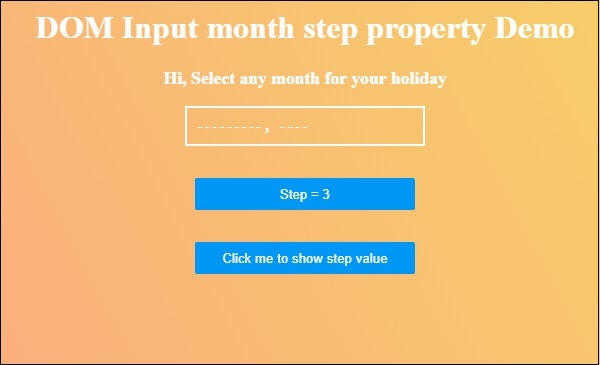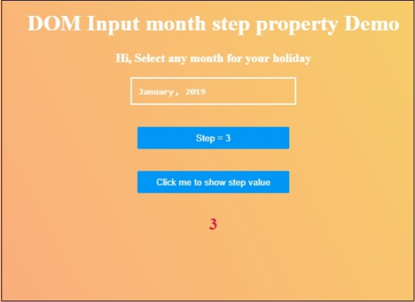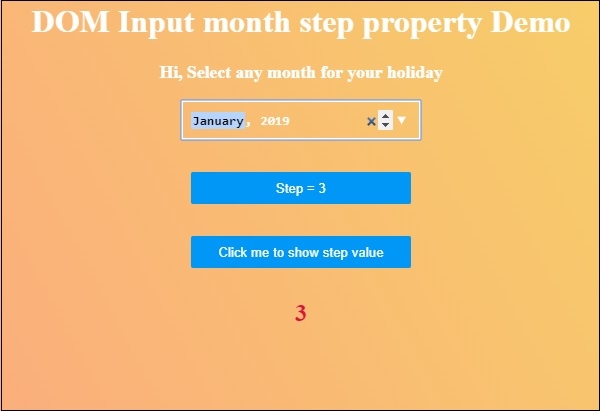 單擊“Step=3”按鈕,將 set 屬性的值設定為 3,然後選擇任意月份,然後嘗試更改它以瞭解 set 屬性如何運作。