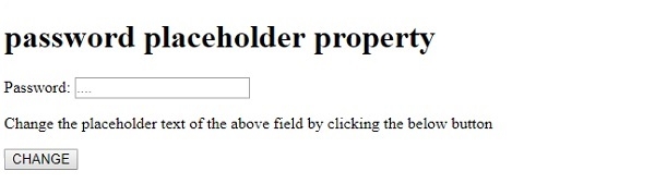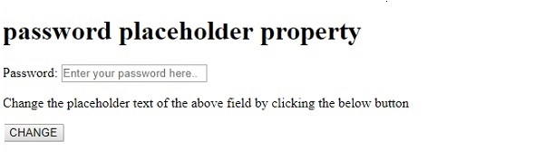 changeHolder() 使用 getElementById() 方法獲取型別為密碼的 input 元素。然後,它將其 placeholder 屬性值設定為“在此輸入您的密碼”,這會反映在密碼欄位中:-