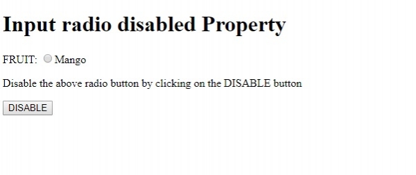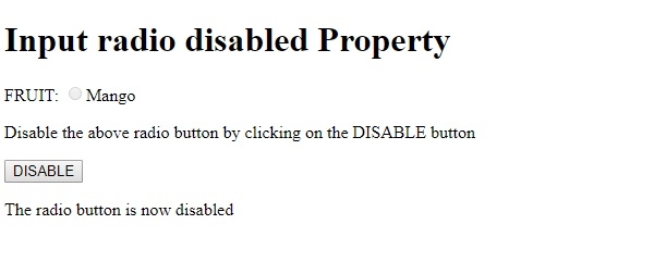 <!DOCTYPE html> <html> <body> <h1>Input radio disabled Property</h1> <form> FRUIT: <input type="radio" name="fruits" id="Mango">Mango </form> <p>Disable the above radio button by clicking on the DISABLE button</p> <button type="button" onclick="disableRadio()">DISABLE</button> <p id="Sample"></p> <script> function disableRadio() { document.getElementById("Mango").disabled=true; document.getElementById("Sample").innerHTML = "The radio button is now disabled" ; } </script> </body> </html>