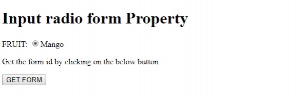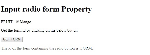 <!DOCTYPE html> <html> <body> <h1>Input radio form Property</h1> <form id="FORM1"> FRUIT: <input type="radio" name="fruits" id="Mango">Mango </form> <p>Get the form id by clicking on the below button</p> <button type="button" onclick="formId()">GET FORM</button> <p id="Sample"></p> <script> function formId() { var P=document.getElementById("Mango").form.id; document.getElementById("Sample").innerHTML = "The id of the form containing the radio button is: "+P ; } </script> </body> </html>