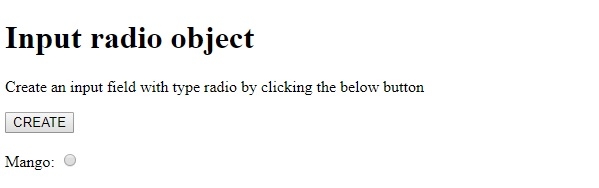 <!DOCTYPE html> <html> <head> <script> function createRadio() { var R = document.createElement("INPUT"); R.setAttribute("type", "Radio"); document.body.appendChild(R); } </script> </head> <body> <h1>Input radio object</h1> <p>Create an input field with type radio by clicking the below button</p> <button type=”button” onclick="createRadio()">CREATE</button> <br><br> Mango: </body> </html>