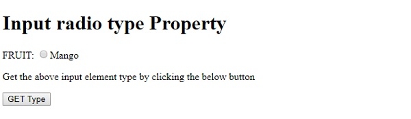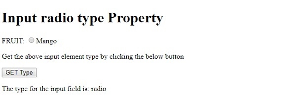 <!DOCTYPE html> <html> <body> <h1>Input radio type Property</h1> <form> FRUIT: <input type="radio" name="fruits" id="Mango">Mango <br> </form> <p>Get the above input element type by clicking the below button</p> <button type="button" onclick="radioType()">GET Type</button> <p id="Sample"></p> <script> function radioType() { var P=document.getElementById("Mango").type; document.getElementById("Sample").innerHTML = "The type for the input field is: "+P ; } </script> </body> </html>