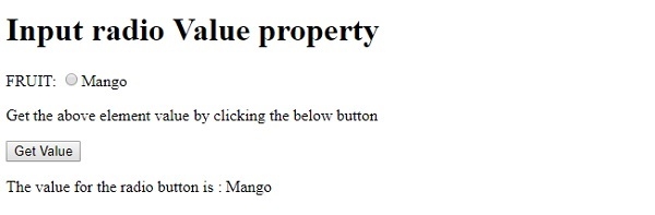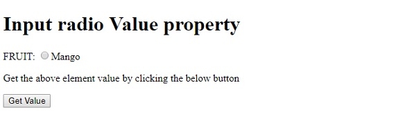<!DOCTYPE html> <html> <body> <h1>Input radio Value property</h1> <form> FRUIT: <input type="radio" name="fruits" id="BTN1" value="Mango" >Mango <br> </form> <p>Get the above element value by clicking the below button</p> <button type=”button” onclick="getValue()">Get Value</button> <p id="Sample"></p> <script> function getValue() { var t = document.getElementById("BTN1").value; document.getElementById("Sample").innerHTML = "The value for the radio button is : "+t; } </script> </body> </html>