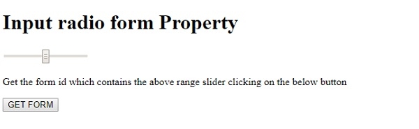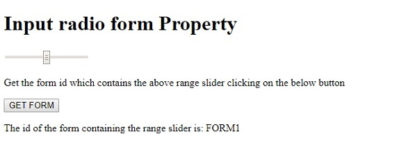 我們建立了一個輸入欄位,包含在表單內,型別=“range”,ID=“RANGE1”,名稱=“VOL”。該表單的 ID 屬性設定為 “FORM1” −