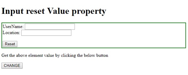 我們使用 type=”reset” 和 id=”RESET1” 建立了一個 <input> 元素。點選此按鈕將重置表單資料。此按鈕位於包含兩個文字欄位的表單中,並且該表單還應用了內聯樣式 −