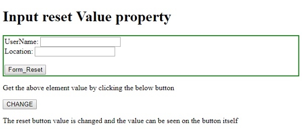 changeValue() 方法使用 getElementById() 方法獲取具有重置型別的輸入元素,並將它的 “value” 屬性值設定為 “Form_Reset”。此值顯示在按鈕本身上。然後,使用其 innerHTML 屬性在 ID 為 “Sample” 的段落中顯示指示此更改的訊息 −