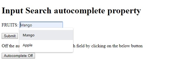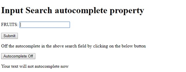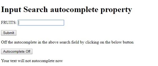 FRUITS: <input type="search" id="SEARCH1" name="fruits" autocomplete="on"><br><br>